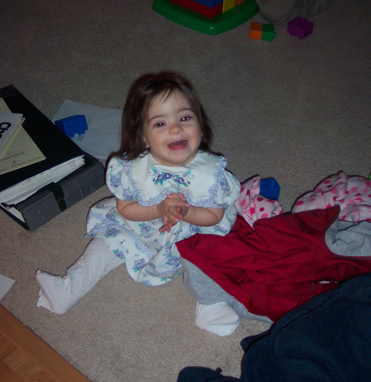 By contrast, Julianna has to be guided/manipulated/forced into every new thing—well, the major ones, at least. Once in a while she surprises me with some new skill or some new evidence of understanding—the most recent being the “honk the nose” game, which my dad invented when Alex was a baby. But basically, we have to take her to the next developmental level. We took her hand and guided it to the toys. Then we took her hand and guided it to the food—which she wasn’t looking at. Then we pounded on the tray to get her to look down. And even with those baby steps, it took months. If we don’t take the lead, she doesn’t particularly change at all. Until she does. There have been two times in her life when she suddenly did a whole bunch of developing all at once. Those are good times.