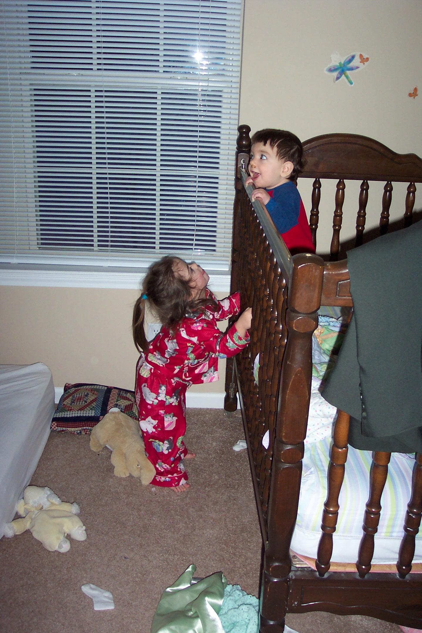 In fact, in some ways Nicholas is already ahead of Julianna in speech issues. He experiments with far, far more sounds than she does, and says them far more regularly. Of course, in other ways she’s ahead of him—in deliberate imitation (everything comes out “muh” whether it’s supposed to be boo or ball or moon or mom or dog or dad, but she’s trying) and in responding to yes or no questions and making choices. This “he’s ahead-she’s ahead” dynamic means that they are incredibly well-matched right now. I am planning a scrapbook page called “Partners in Crime.” Here’s a preview.