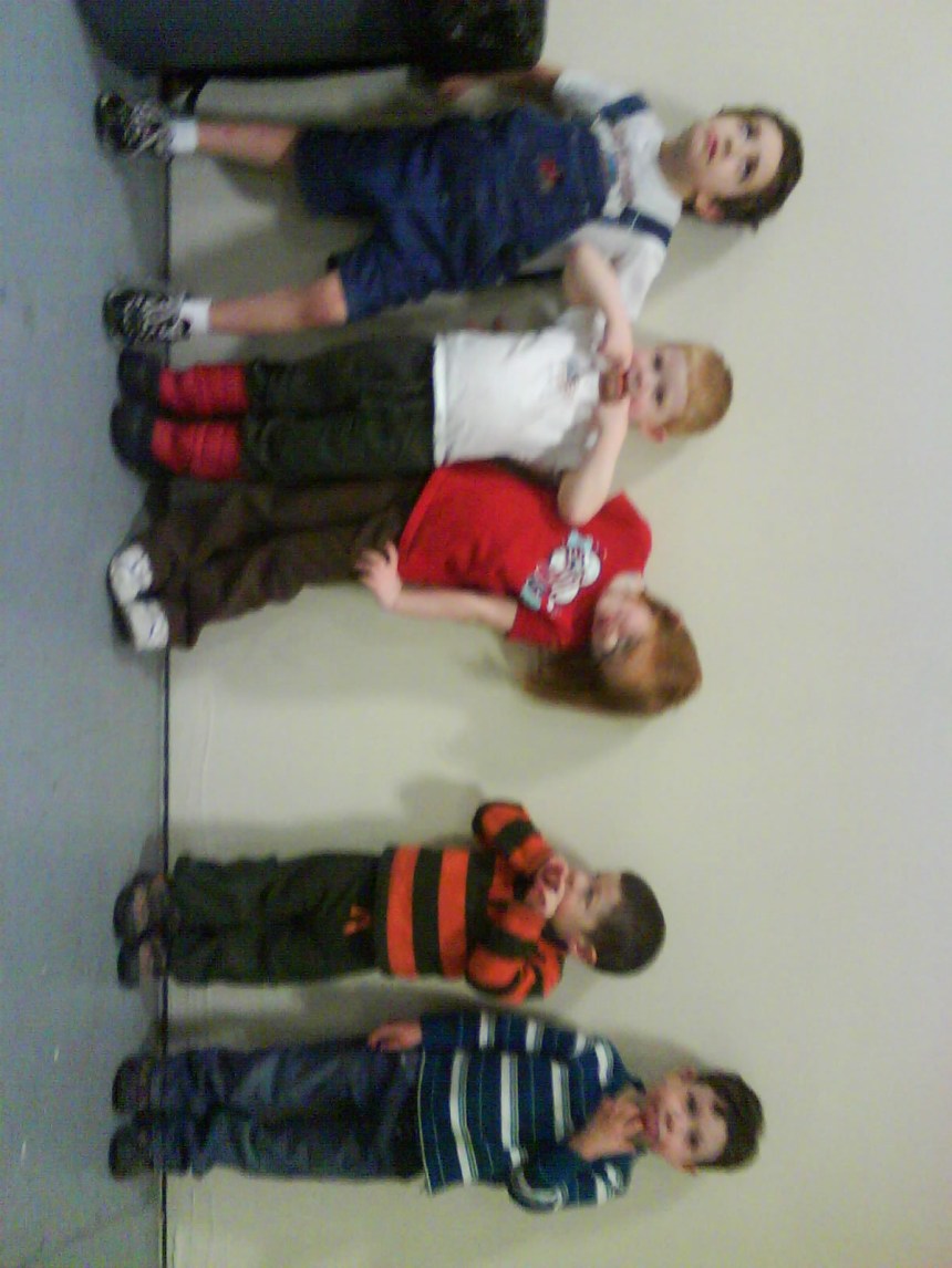 7. To round out my “roundup” I’d like to share a picture. Last Friday evening we went to the K of C fish fry with two sets of friends, for a total of seven children age 6 and under. The kids finished eating long before the adults, and started running around. One of the dads corralled them by having them flatten themselves against the wall whenever anyone walked by…which progressed to making silly faces while they stood there. We were all in stitches, but unfortunately no one had a camera; only a cell phone. So please excuse the blurred photo. You can get the idea, anyway.