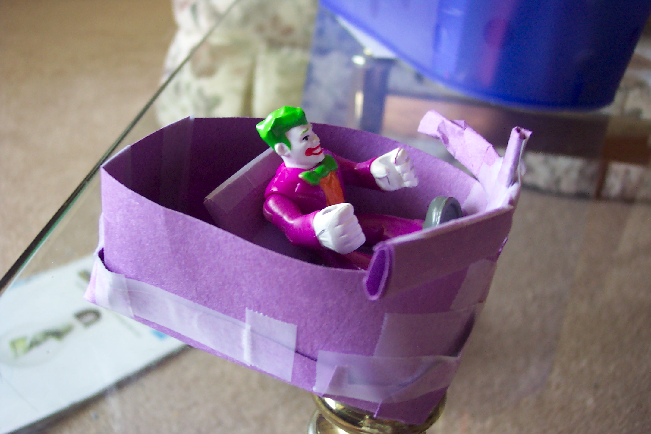 3. Have I ever shared how much I loathe playing? (Kind of a big occupational hazard of SAH motherhood, but there it is. Even when I was a kid, I was a climb-a-tree-and-read-a-book-worm.) So I cringe every time Alex says, “Mommy, will you play with me?” But today, he was entertaining himself very nicely in the living room with scissors, construction paper and tape, building a “Joker Ski” (as in jet ski). Until he leaned back dramatically and said, “Mommy, you can help me finish my Joker Ski if you want to.” Translation: Mommy get your butt out here I’m tired of doing this and I want you to finish it for me. Voila the Joker Ski: