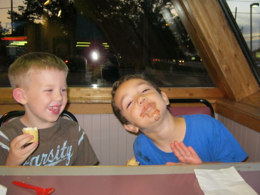 He started out giving me some attitude, but he ended the night under his teacher’s spell. (At least, I think so. I hope so. Otherwise it’s gonna be a long year. Or thirteen.) And we celebrated by going out for ice cream with a schoolmate.