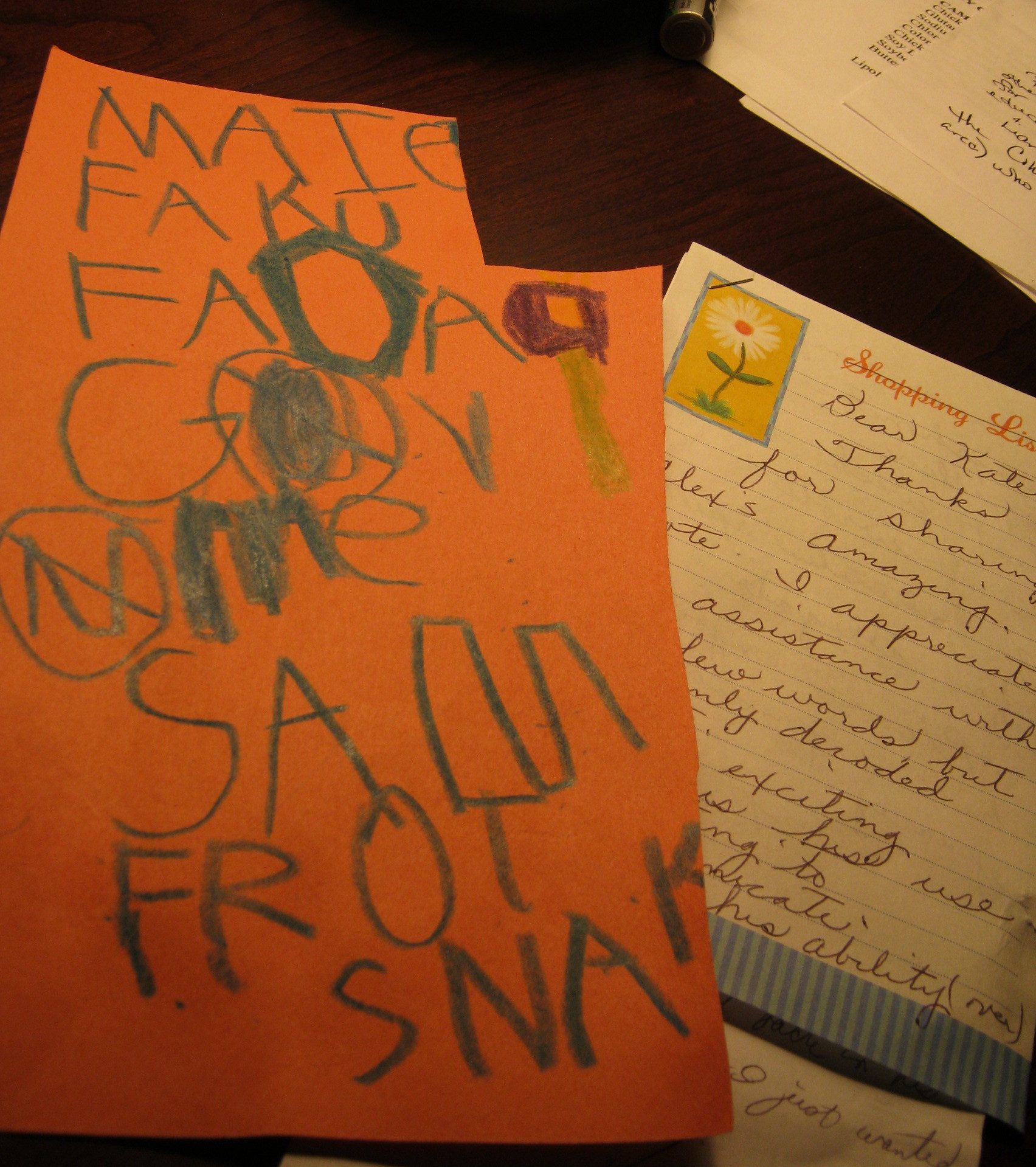 It wasn’t until Christian came to take a look at it that I realized how profound was the slip of construction paper I held in my hands. It just looks like a bunch of letters. But there’s a message here, “th”‘s coded as “f”, strike throughs and haphazard guesses at spelling notwithstanding. And when I realized that he did this without help, it took my breath away: