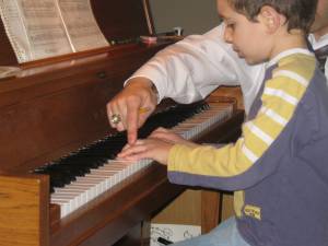 Alex has begun taking piano “lessons” from his daddy. And he’s really excited about it. Which is really exciting to me. I got all sniffy and sentimental watching my boys at the piano–so much so that I had to go get the camera. He won’t take from Daddy long-term, but for an introduction it works. They went out and bought him his very first piano books yesterday.