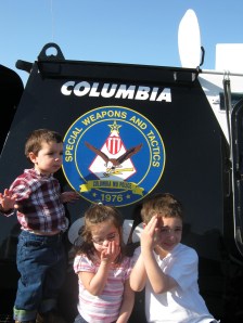 Last week was “Tons of Trucks,” an event hosted by the city and Parents as Teachers. Aside from the horn-honking, which gave me a headache and freaked out both my little ones, the kids enjoyed it. I should say, eventually they enjoyed it. Up front everyone had a whiny attitude and wanted to run a different direction in the crowds–or they wanted to be held by Mommy. You can see the lack of thrill-dom in their faces. Thankfully, after work a second pair of hands (Daddy’s) arrived to help and things improved.