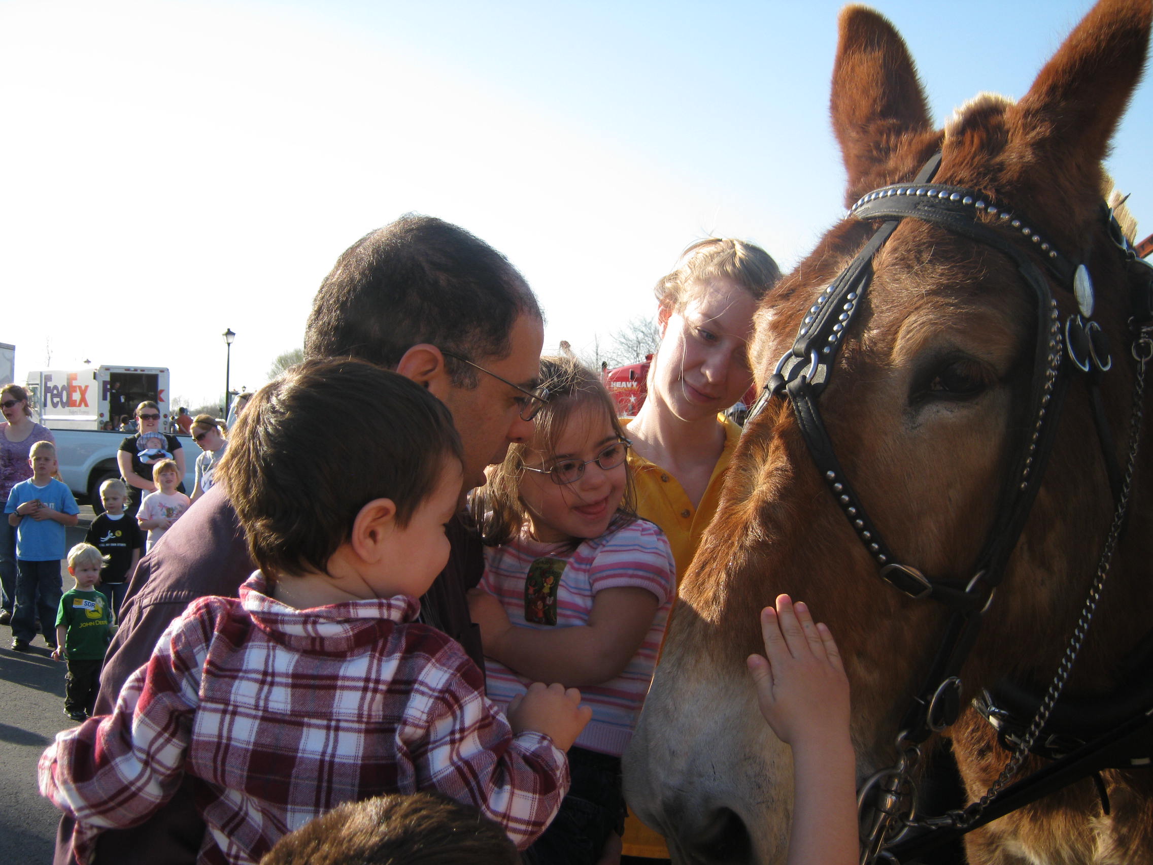 I haven’t mentioned here that Julianna is obsessed with horses. It’s all she “talks” about. “What did you do at school today?” we ask, and she signs HORSE! We say, “Why don’t we go play outside?” and she signs, HORSE! I think it’s a function of the carousel at the Mall. She adores the carousel. Thus, her favorite part of the Tons of Trucks was not the trucks at all, but the chance to say hello to the mules. These mules are connected with the school of agriculture, and they make appearances in every parade and local event. It took her some time to overcome her “love/hate” relationship with any living thing, and of course, I never actually managed to get the camera to take a picture while she was touching it (stupid delay–why don’t point & shoot cameras TAKE THE PICTURE WHEN YOU PRESS THE BUTTON????? Yes, I know they have to take time to focus, but even when I have it half-pressed, i.e. focused, and waiting for The Moment, it still delays by almost a full second–even on kids & pets setting!), but you get the idea, nonetheless: