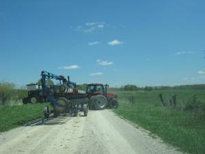 Following the tractor from “staging” area to the field. This planter picks up and rotates 90 degrees via hydraulics in order to put it in “transport” position, because it is too wide to take on the road. I have never seen the transition before, and it was pretty cool to watch.