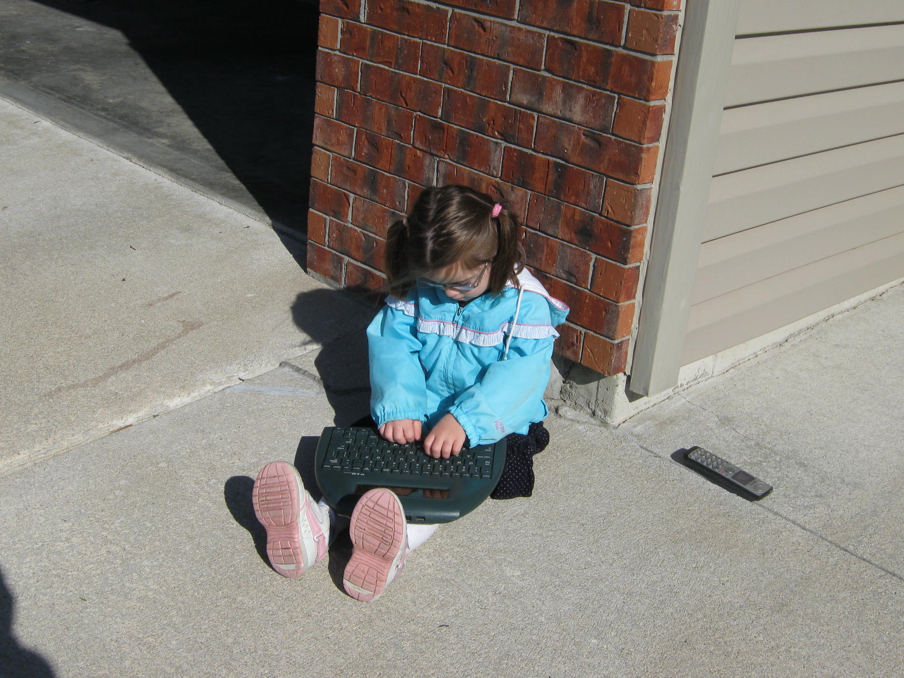This is where I sit to type while the kids are playing outside. And although it doesn’t look like it, she was typing, too. The proof is on my NEO, waiting to be cleaned up today. 🙂