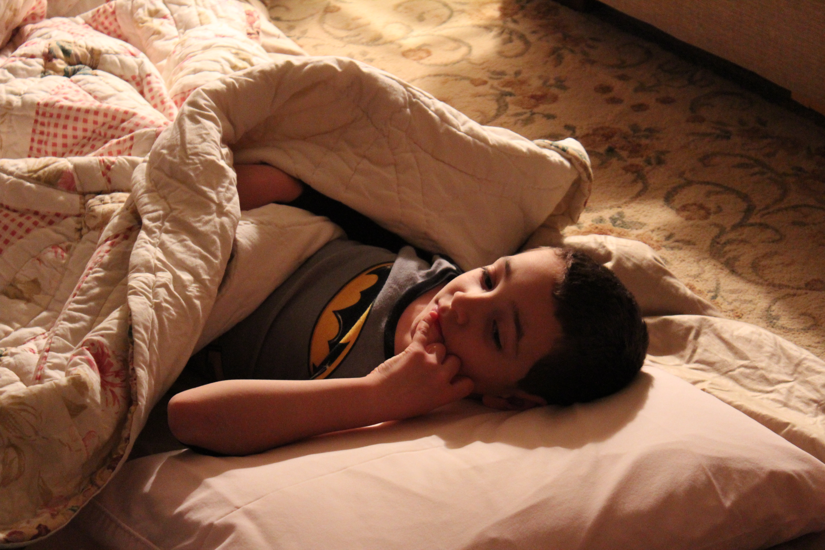 I put him to bed on the floor with whatever blankets we could scrounge up: a baby blanket, his Santa Claus Snuggie, and Julianna’s fuzzy robe for extra insulation. “How’s that?” I asked.