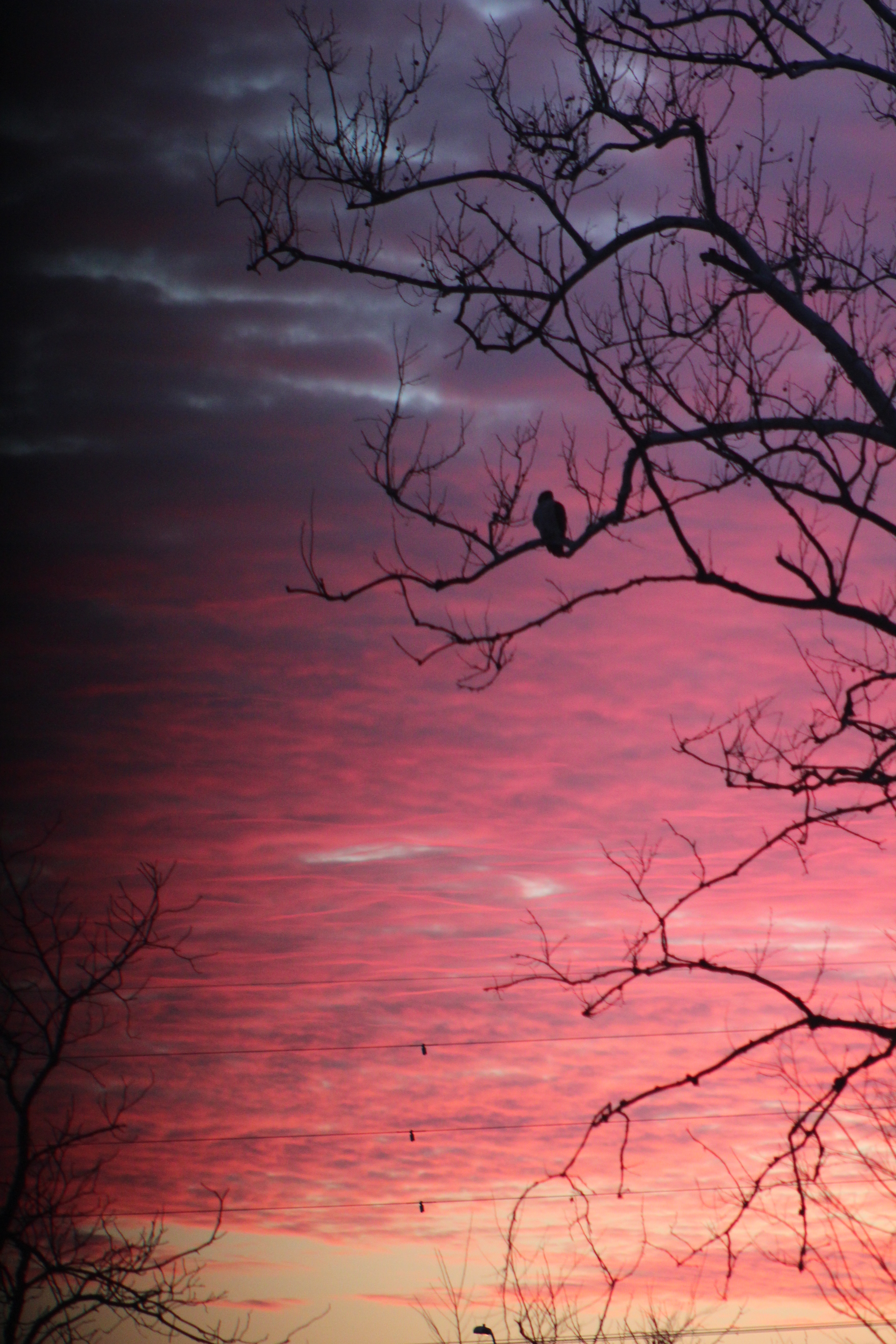 Because I need a #7, I’ll show you a picture I took a few weeks ago and haven’t found a use for. We have a hawk living in our little strip of woods behind the house, and some mornings it perches for half an hour on an arched branch facing eastward, as if it’s watching the sunrise. The morning I managed to capture it, it had chosen a different branch, higher up, but nonetheless: