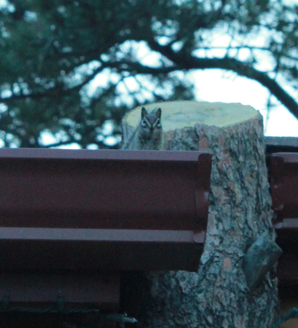 Every morning I have an encounter with a family of chipmunks who live, apparently, on the roof of my cabin. They’re cute.
