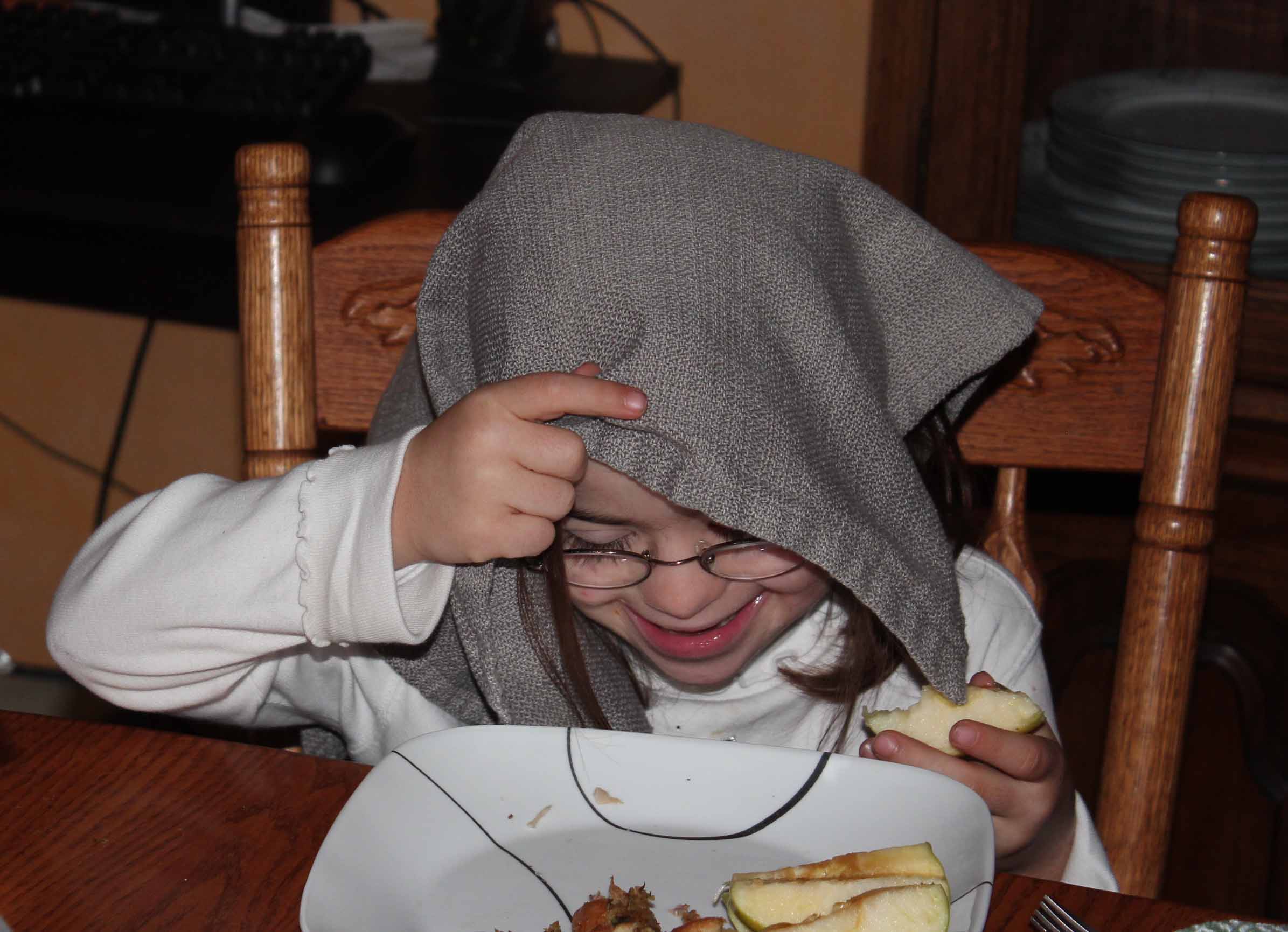 NapkinheadJulianna is in love with Mary Poppins at the moment. She asks for the movie virtually every day the instant she gets off the bus, and sometimes before (although it comes out sounding more like “Harry Potter”). But Mary Poppins is a long movie, and there’s crying and drama every time we have to turn it off to come to the table for dinner. Last night, though, was a leftover pasta night–and fresh gingerbread cookies for dessert–so the drama dissipated quickly. “Hay-ee Pah-ee?” she said hopefully as she nibbled her cookie.