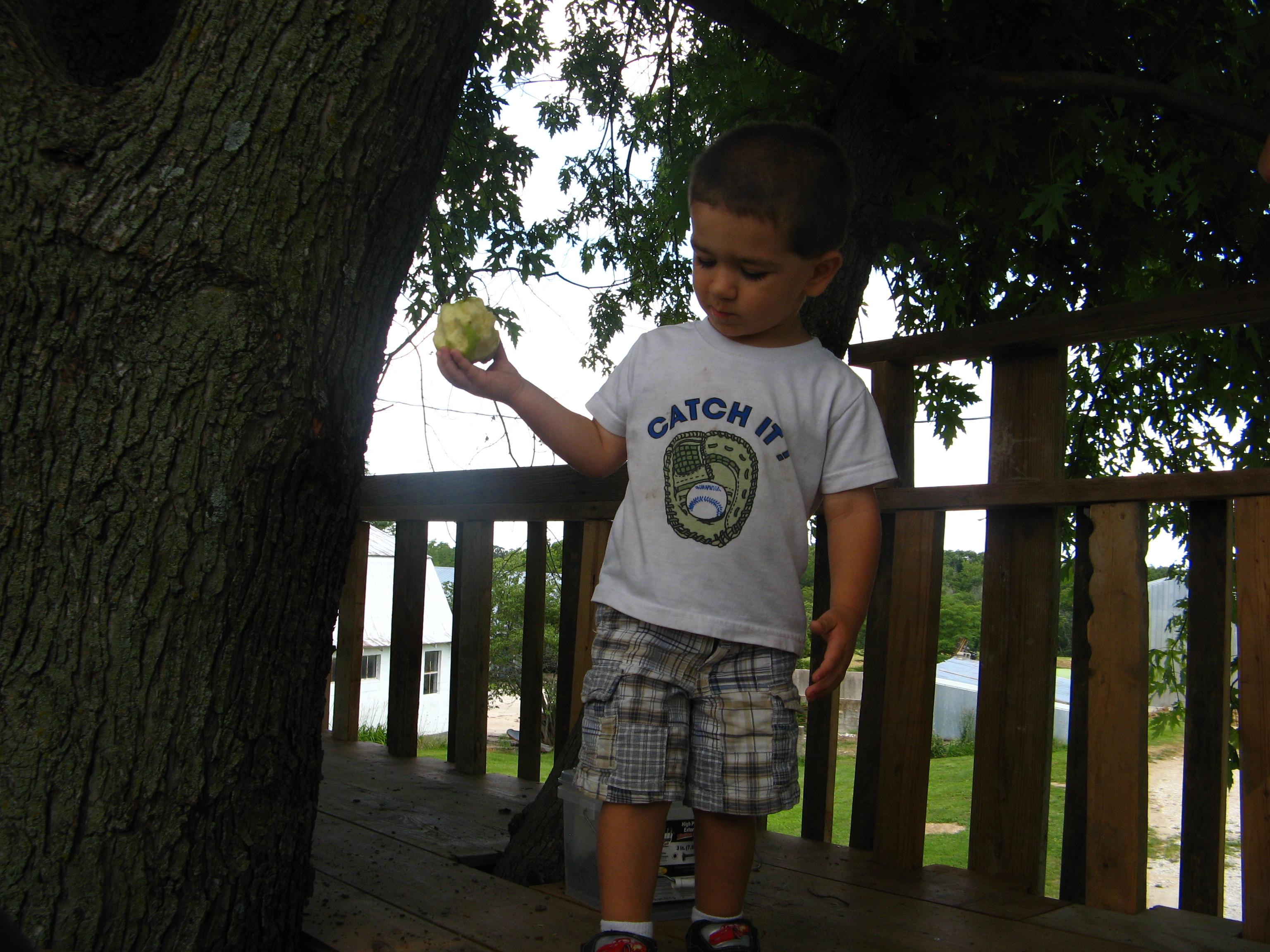 Over the Fourth of July, our family got together at my parents’ farm to build a treehouse, the look of which was designed by Alex and his cousin, and the engineering of which was puzzled out by my dad, repurposing boards from bins in the upstairs of the garage (you can see pictures of that interesting building here).