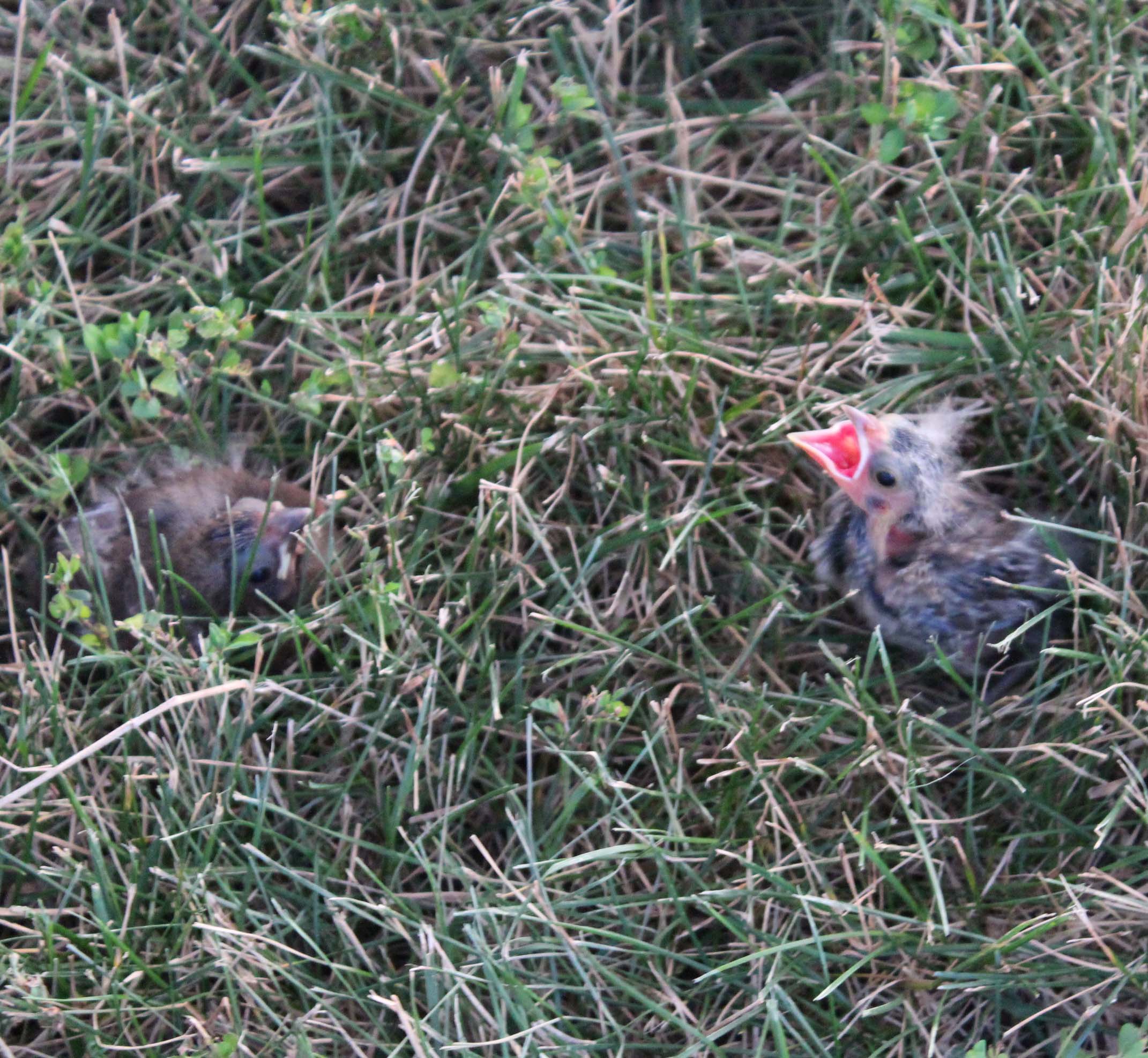 Wait. Not baby bird. Three baby birds. On my lawn, under the tree. We thought they were dead, or dying. Until the daddy flew around, cussing at us, and the babies reared up squawking, three little mouths wide and red.