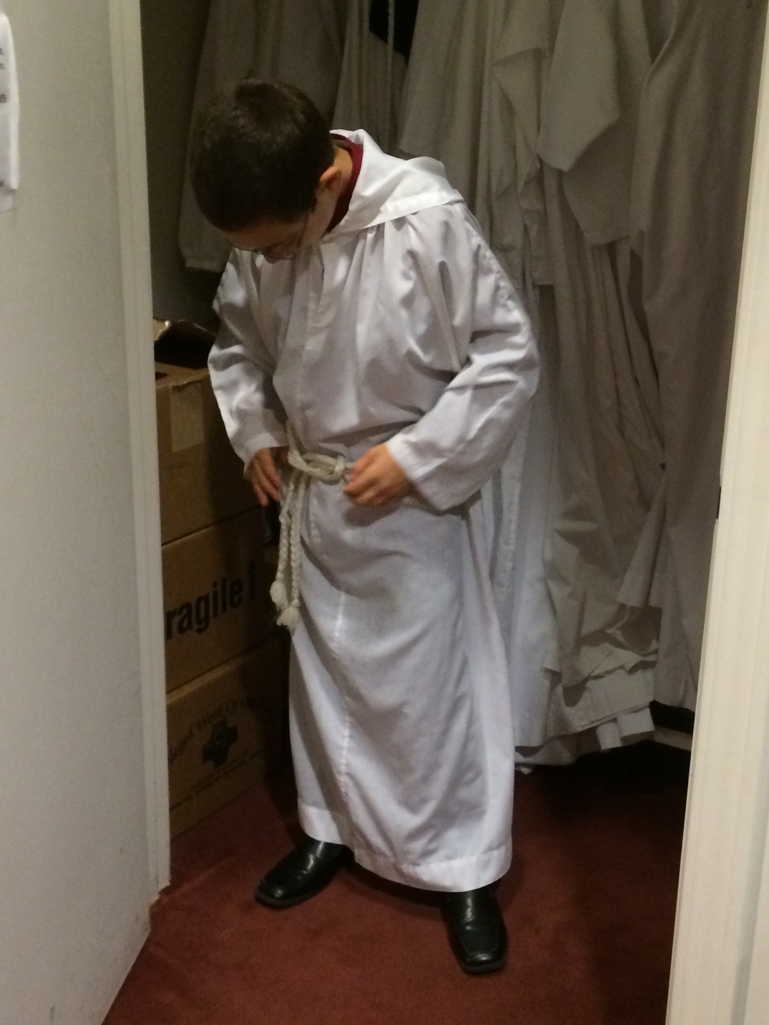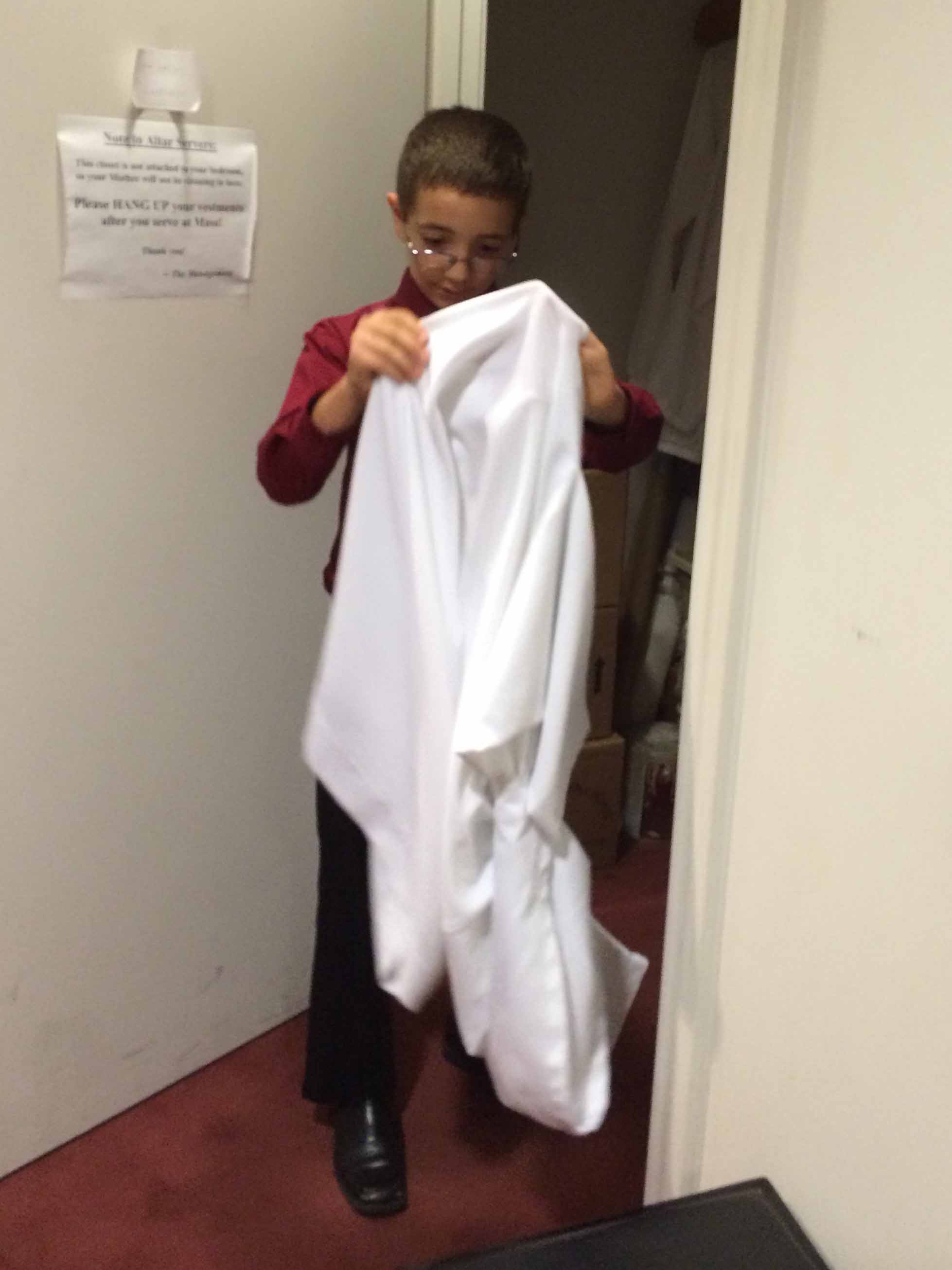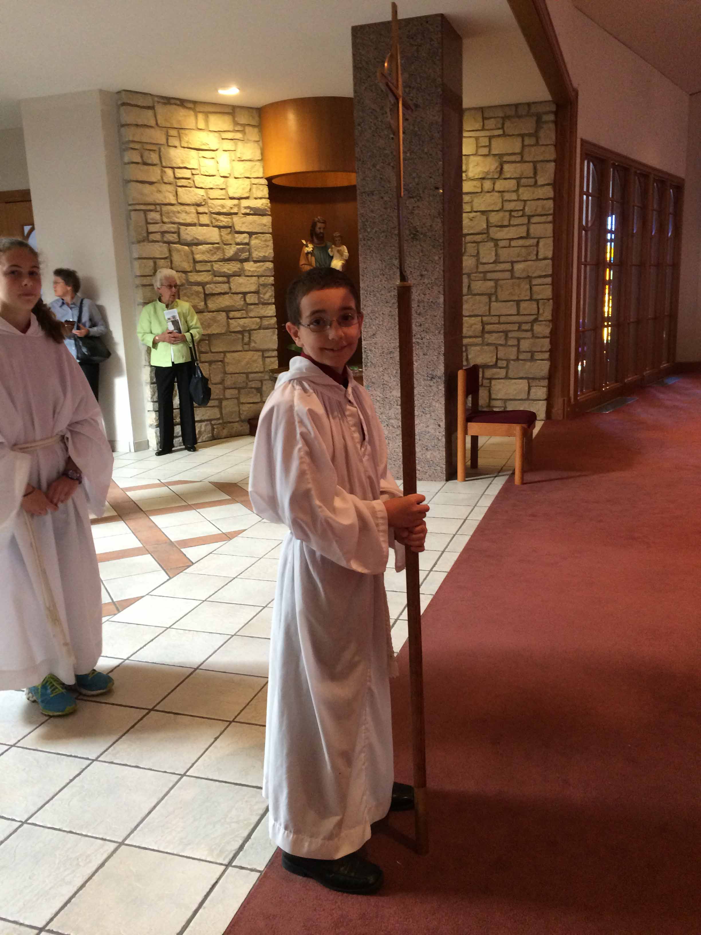 Wow, brand new altar boy and he got to carry the cross. Parishes we’ve been in always reserve that for the older more experienced boys. You have a lucky son