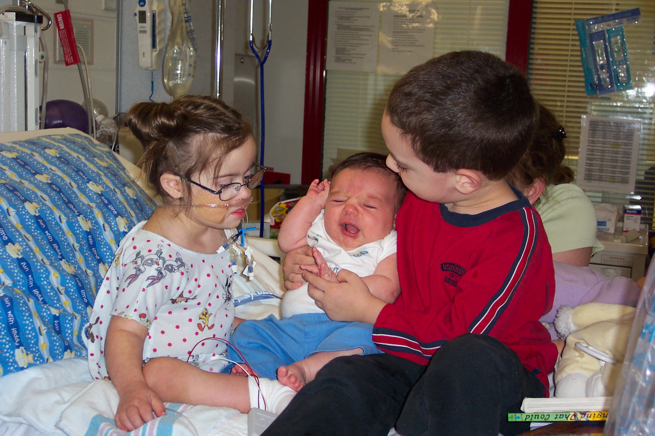 Two years later, Julianna was in the P-ICU again. They never indicated that she was in danger this time, although they didn’t pretend that pneumonia was no big deal, either. For several days of that hospital stay, the room next door was occupied by an infant—all but newborn. For the first three days I never saw a parent in the room. I never asked, because I knew the staff couldn’t tell me anything, but the only things that stopped me from begging to go in and hold that baby were 1) I already had a baby living with me in the P-ICU, and 2) my daughter was gravely ill, and I didn’t want to pass it on.